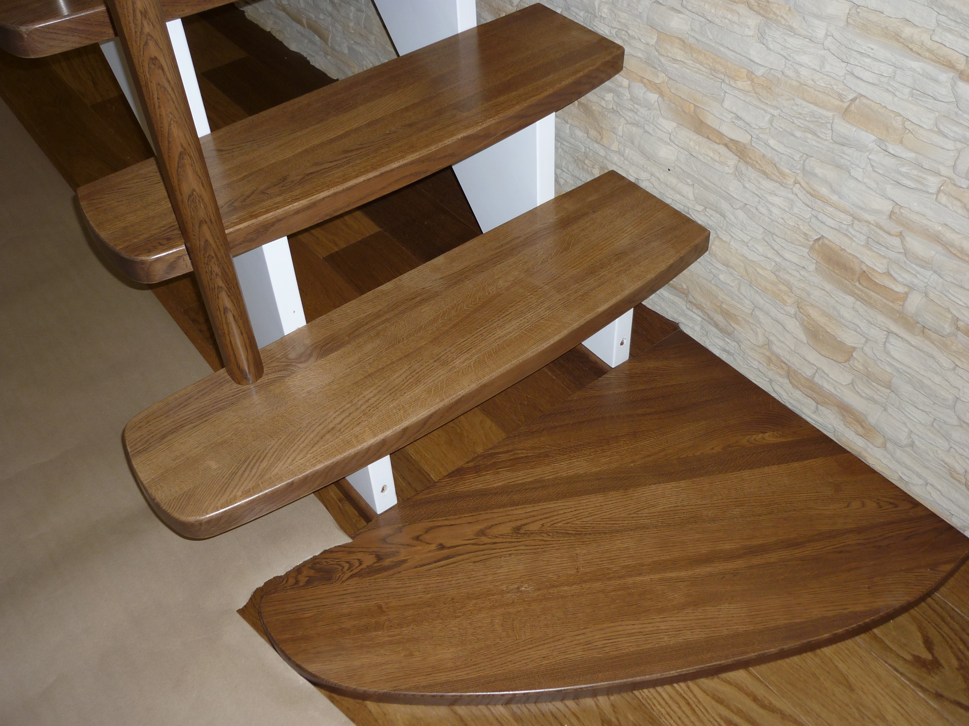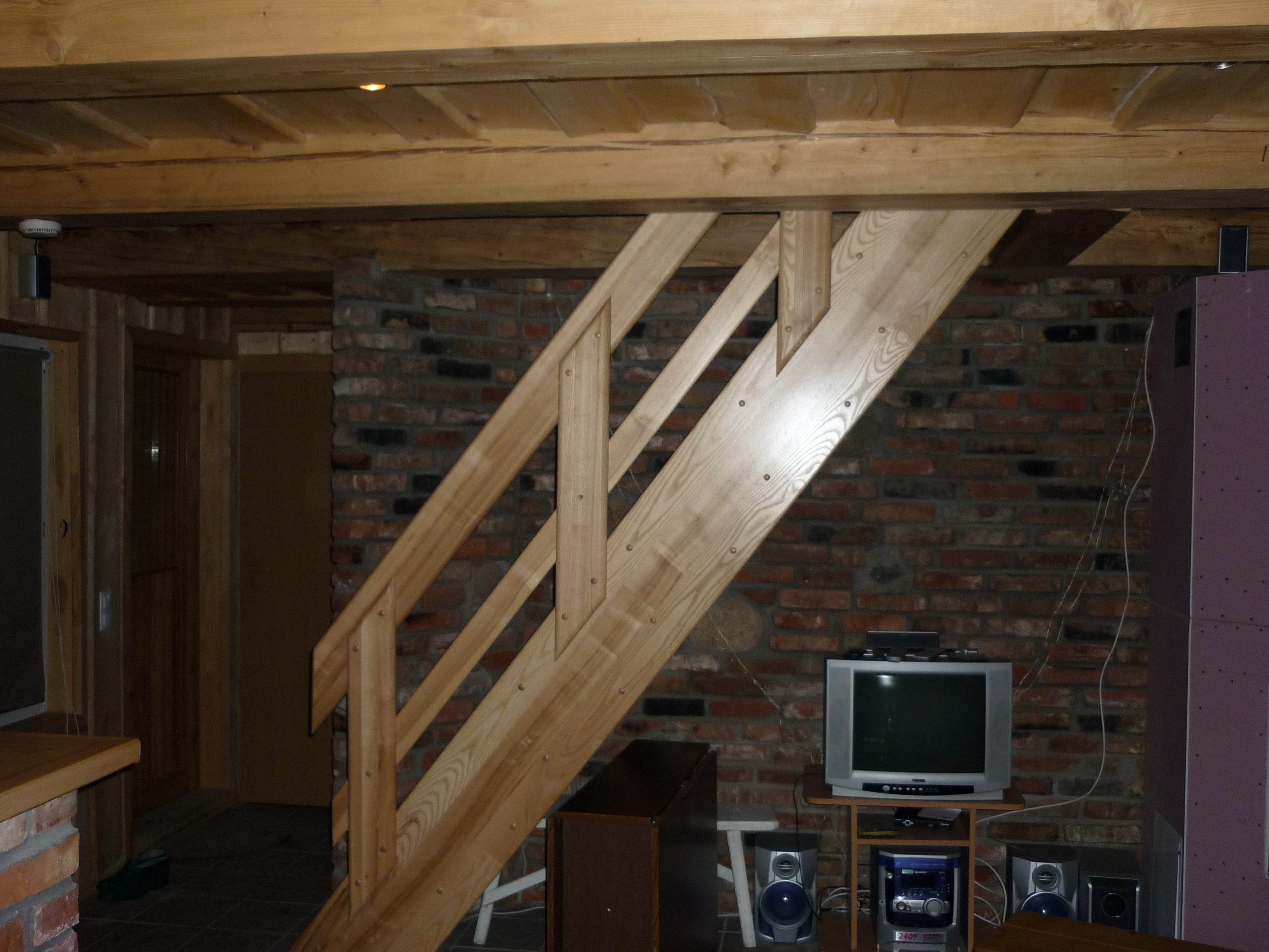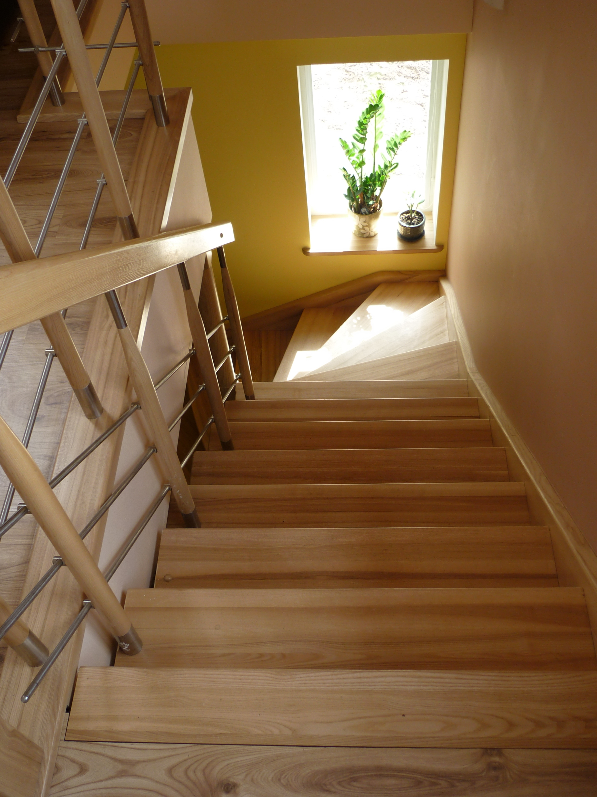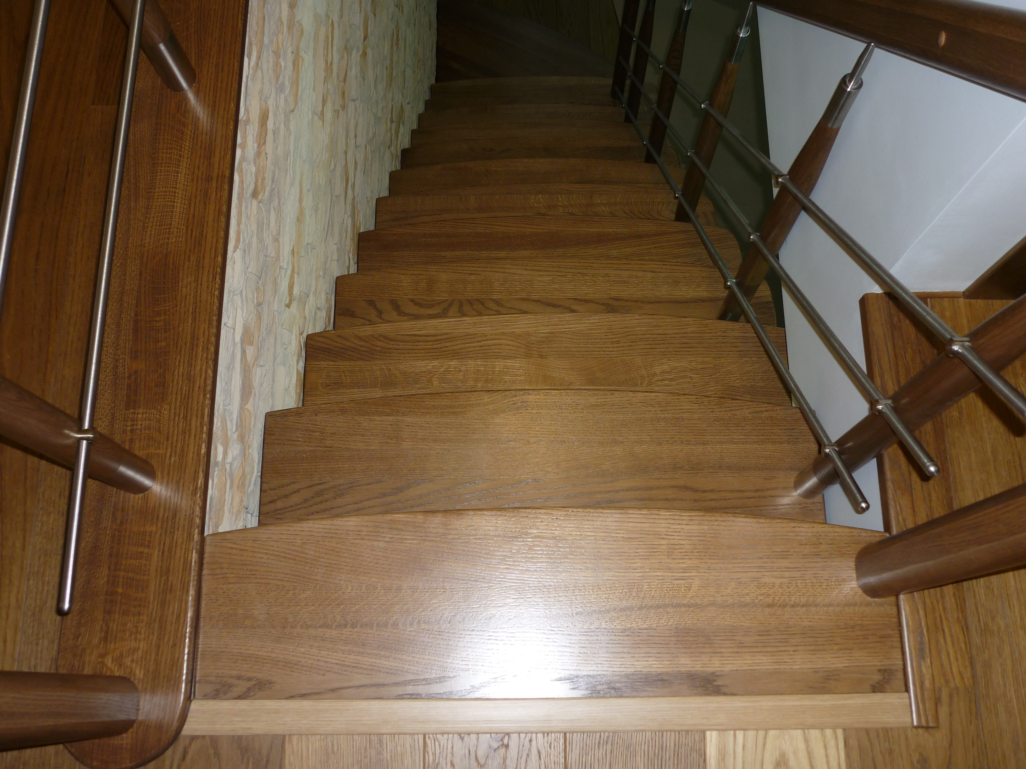Tiesūs ąžuoliniai laiptai ant medinės laiptasijos.