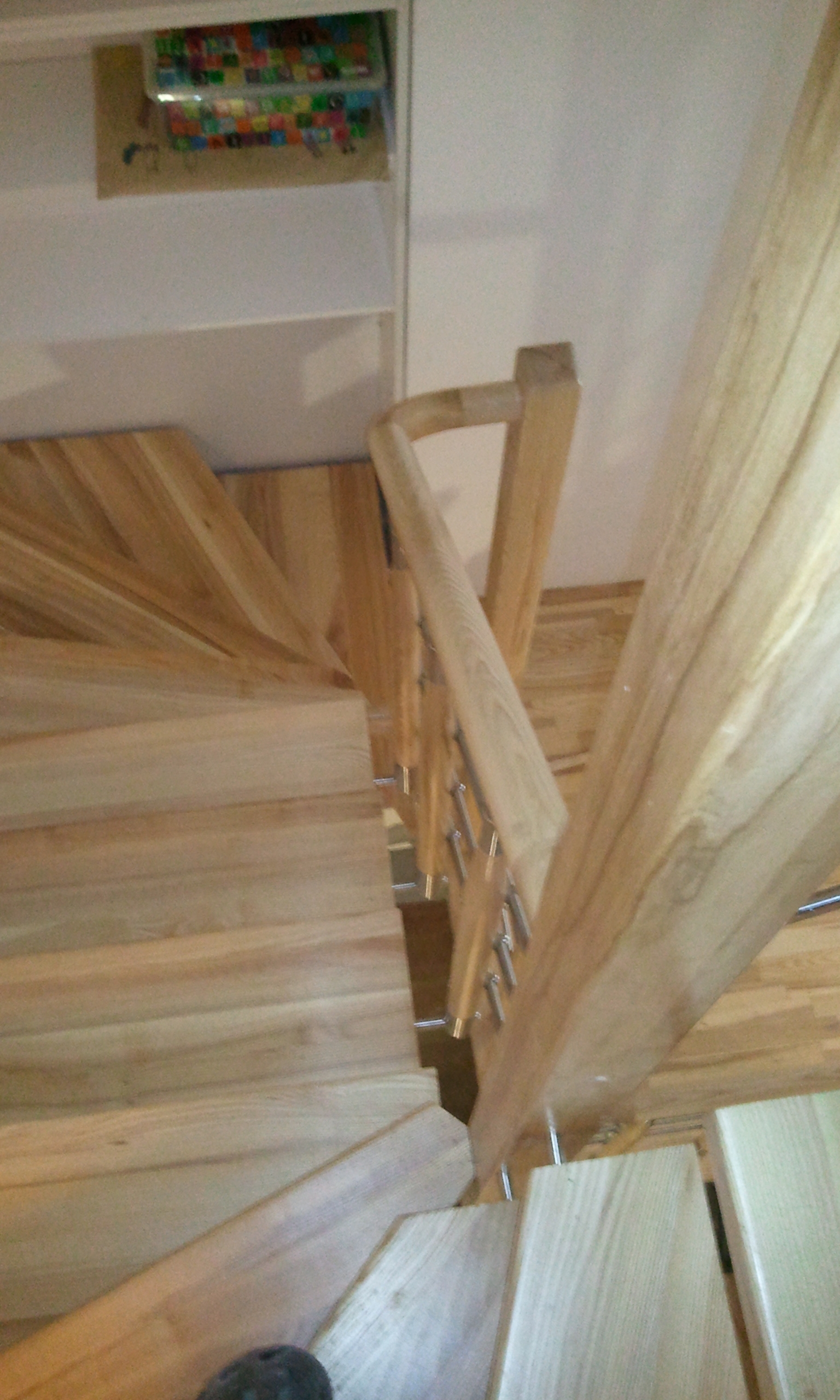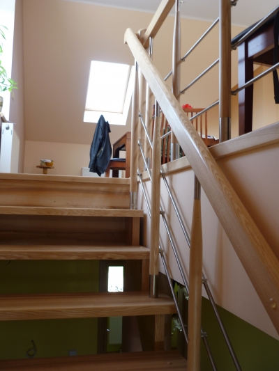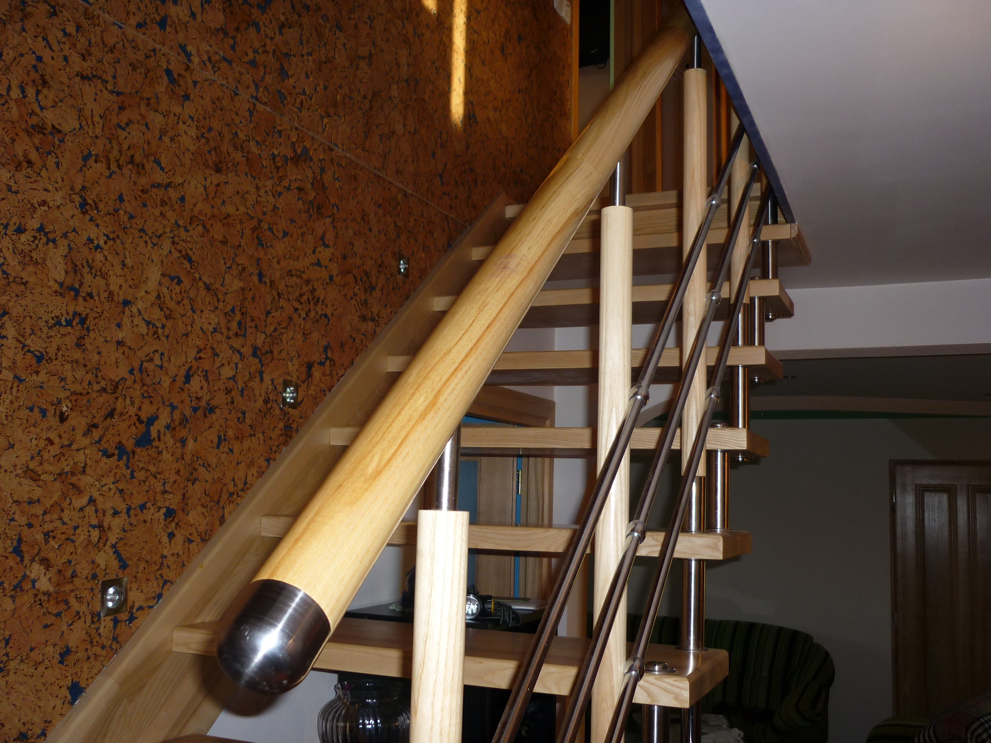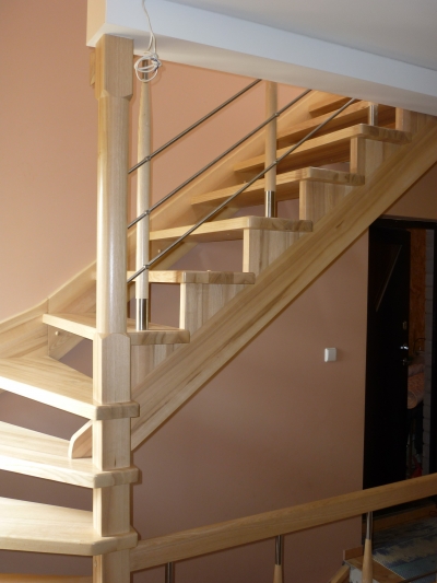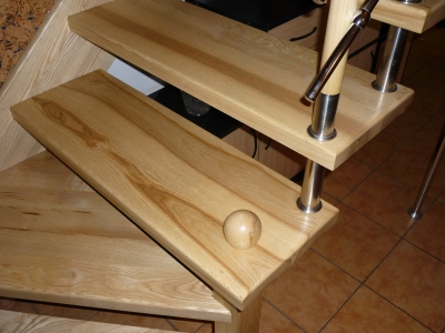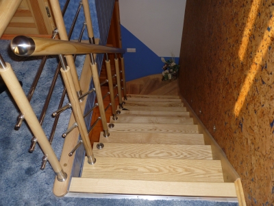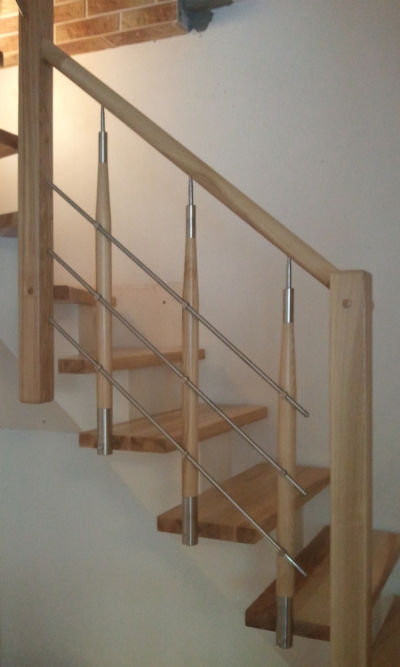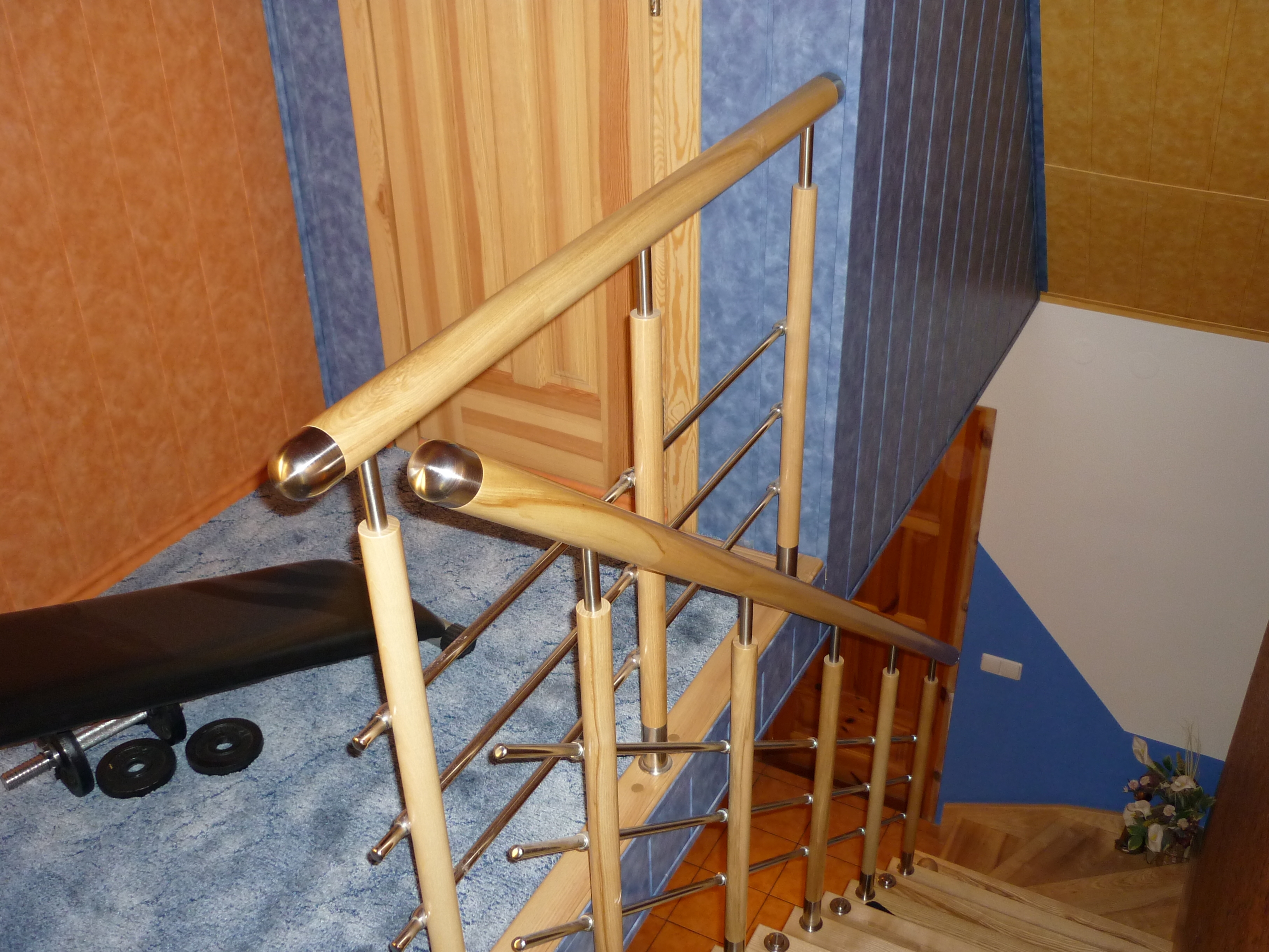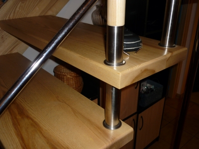 Laiptai ant metalinės laiptasijos. Porankiai pritvirtinti į pakopos galą.