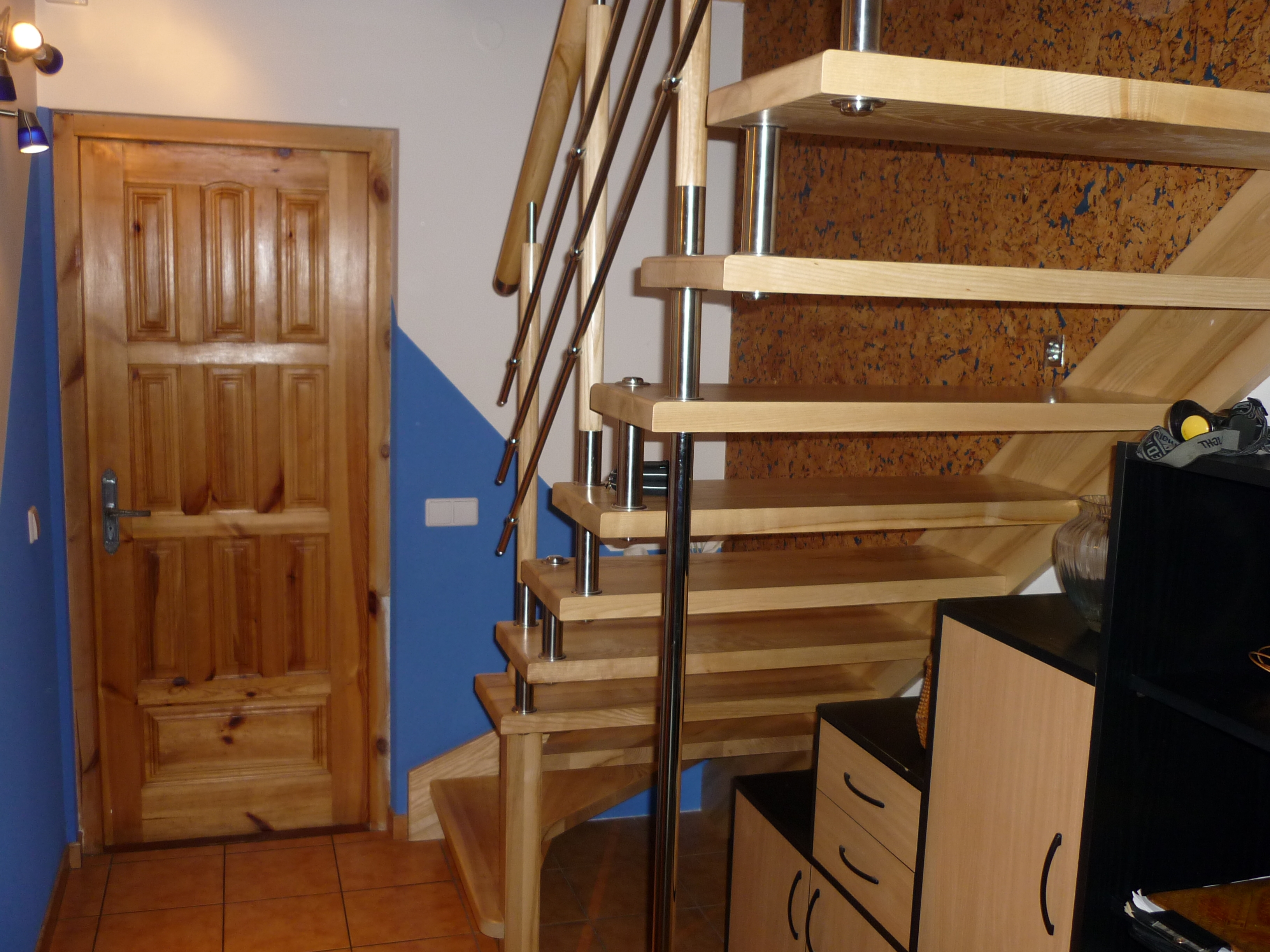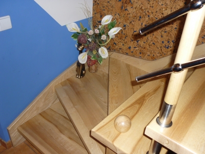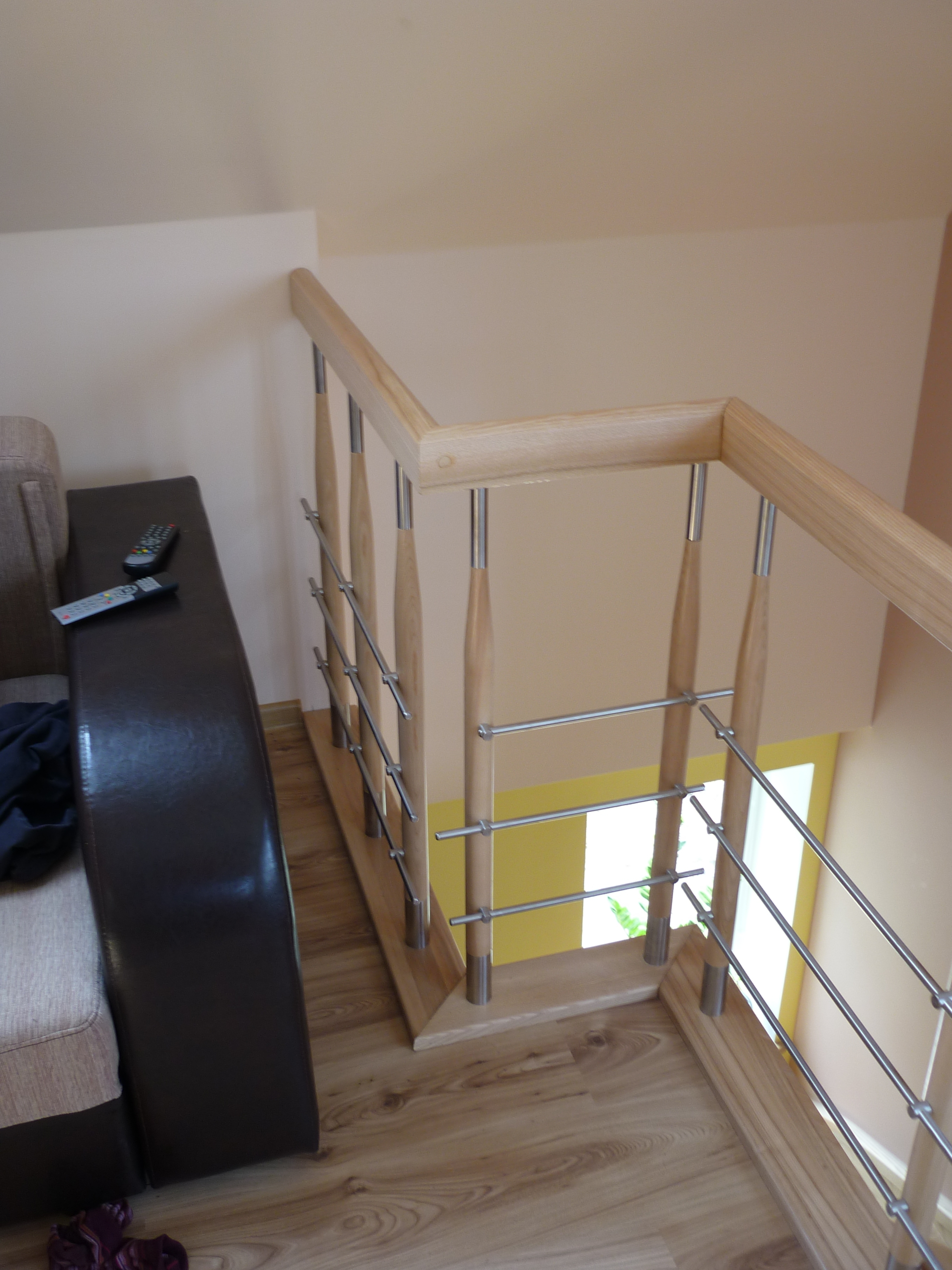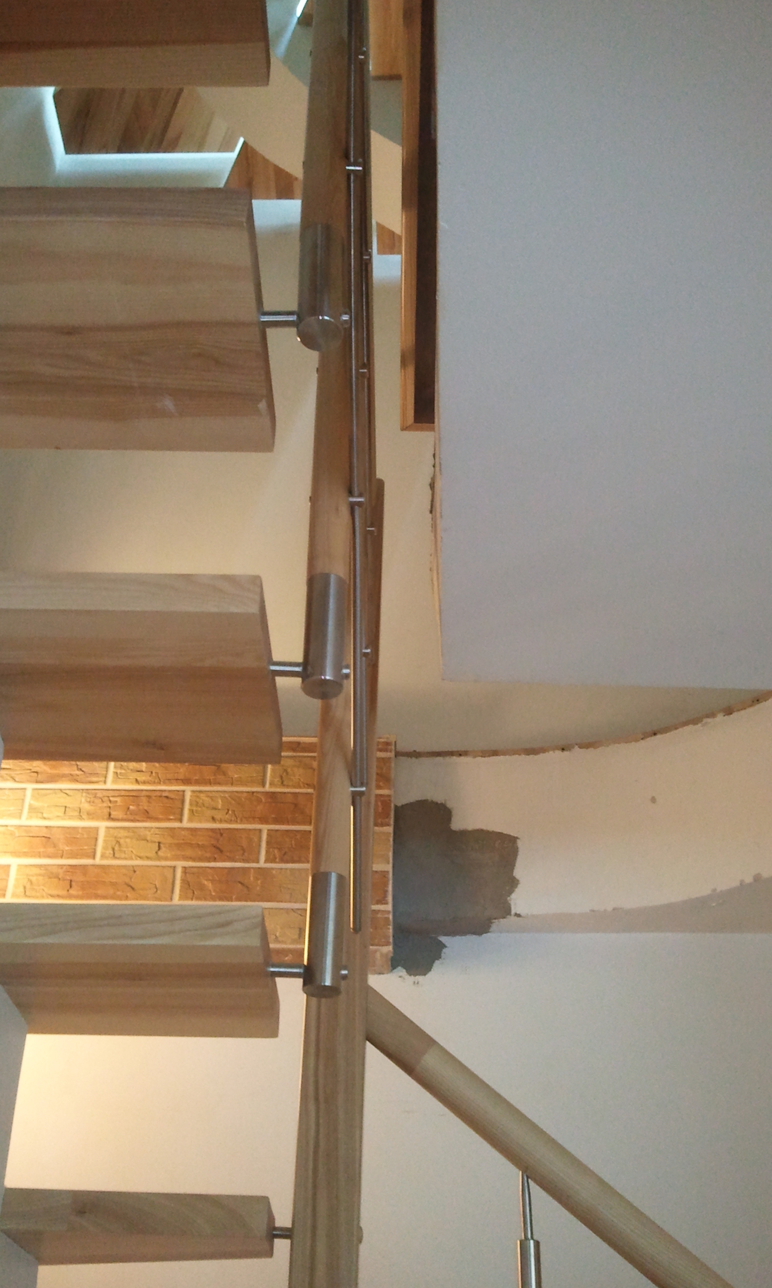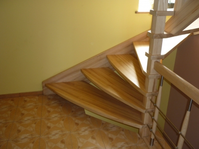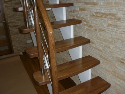Laiptai ant metalinės laiptasijos. Porankiai pritvirtinti į pakopos galą.