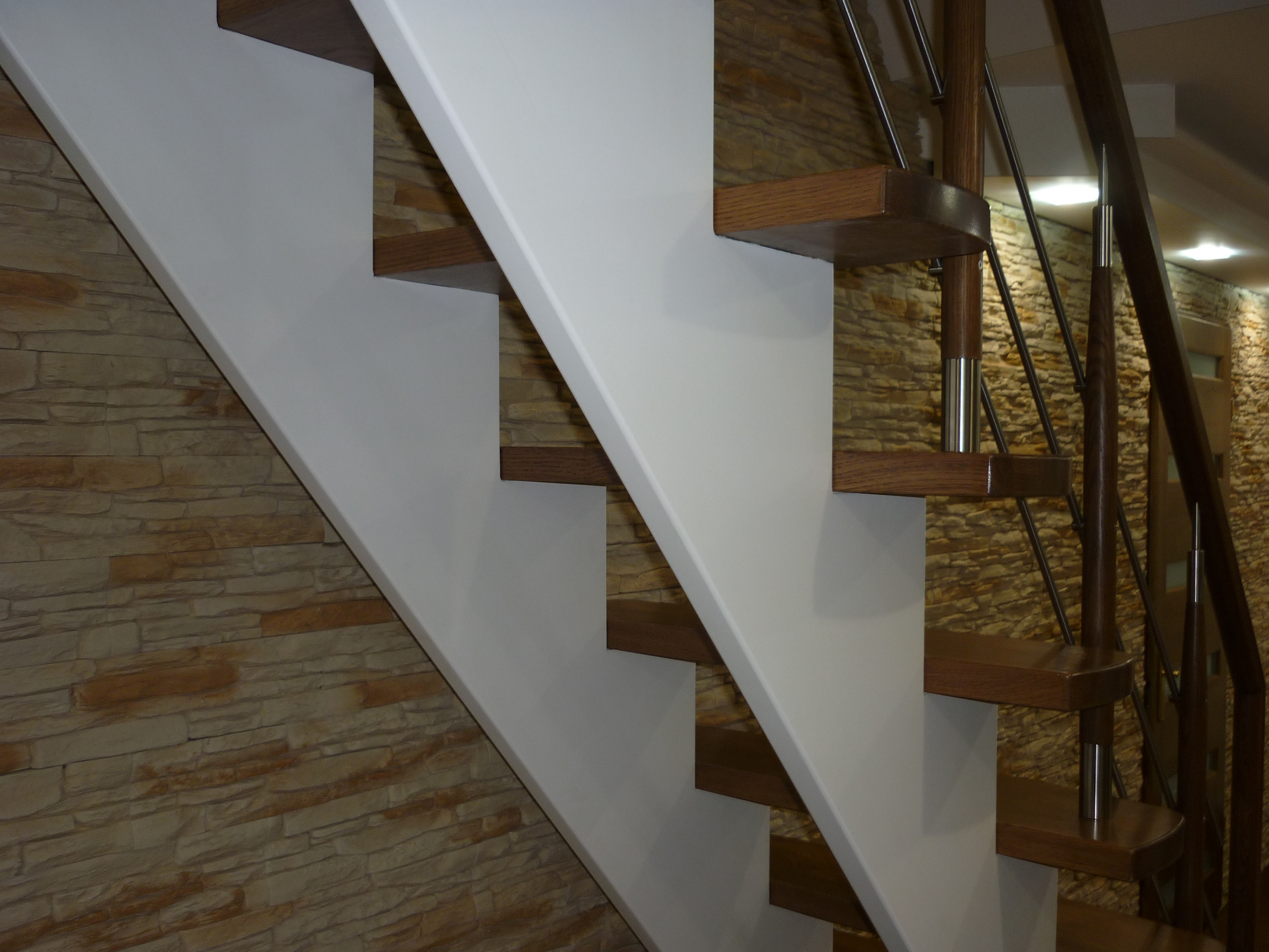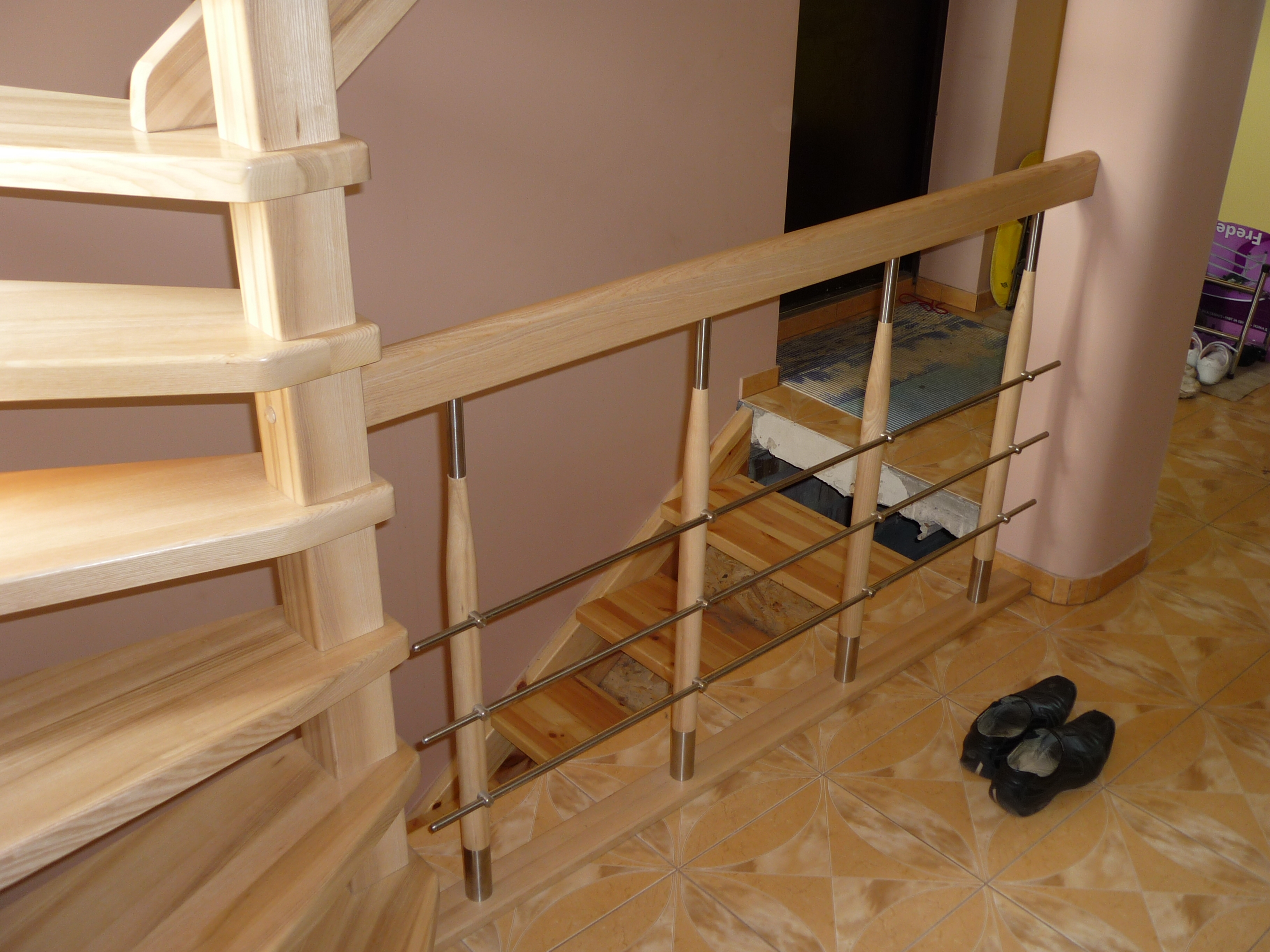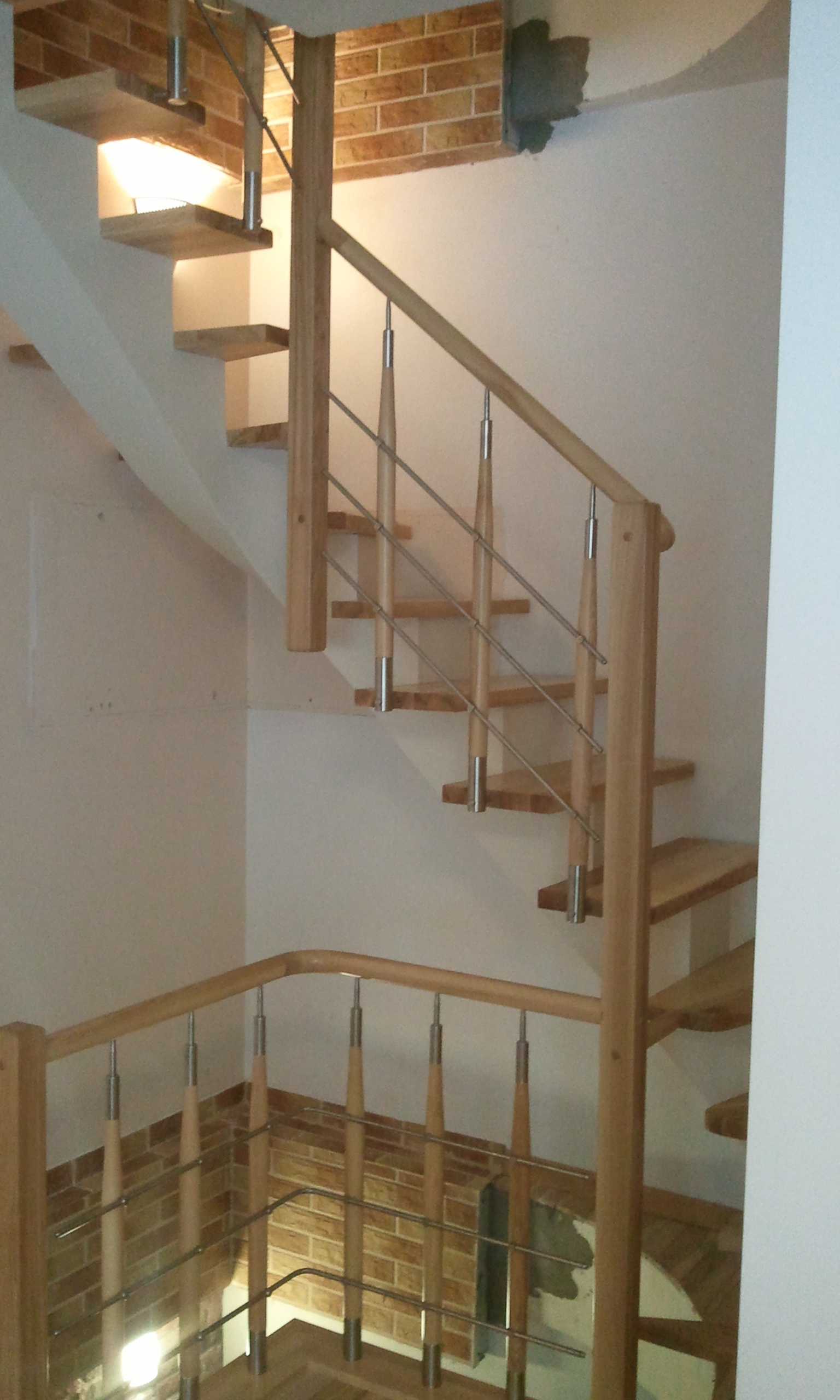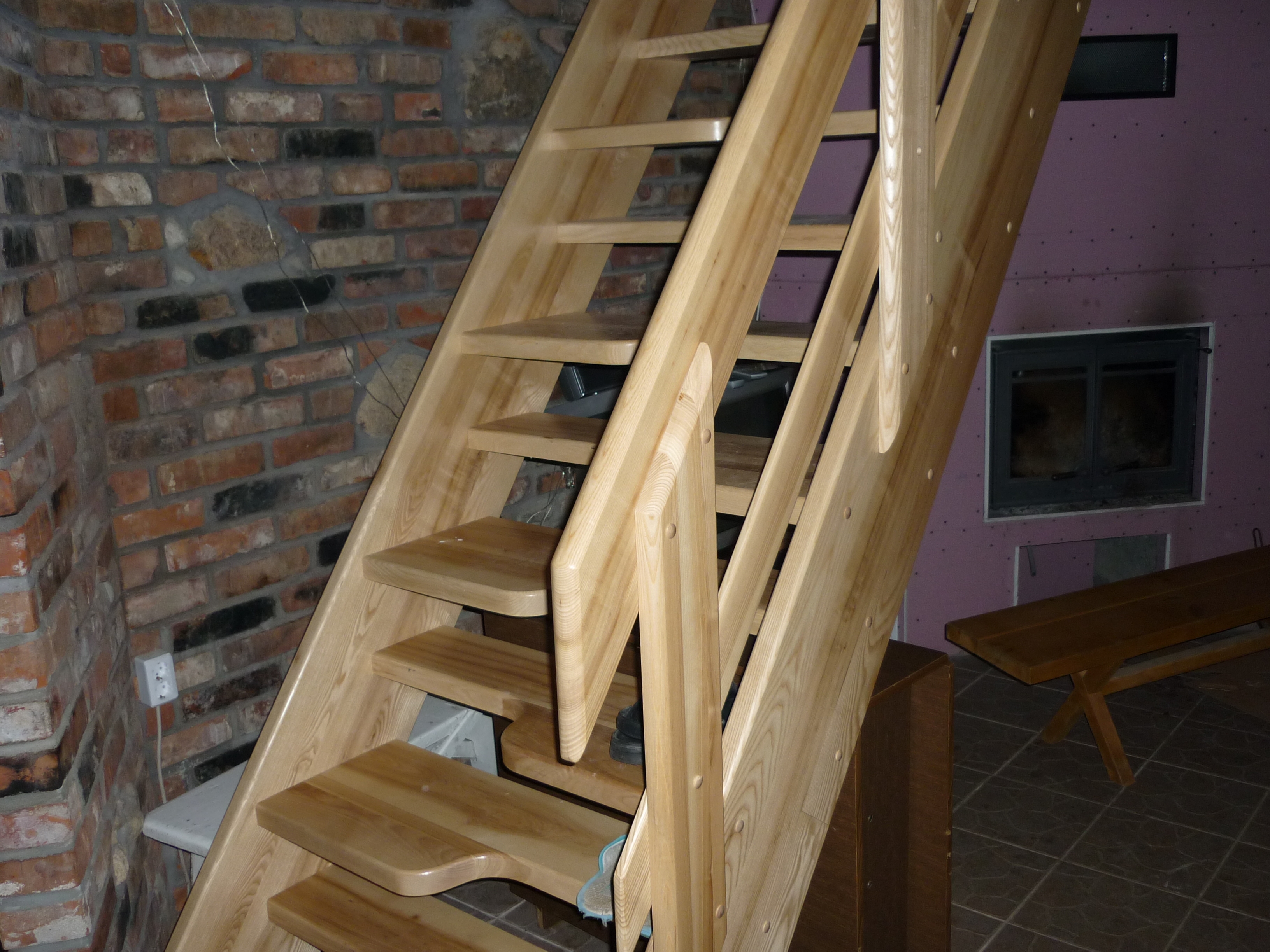 Laiptai ant metalinės laiptasijos. Porankiai pritvirtinti į pakopos galą.
